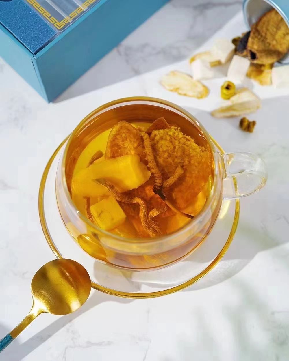「配方」 冬蟲(chóng)夏草10克,乳鴿1只,花膠30克,(花膠又名魚(yú)肚,是從魚(yú)腹中取出魚(yú)鰾,切開(kāi)曬干后而成。)生姜1片。