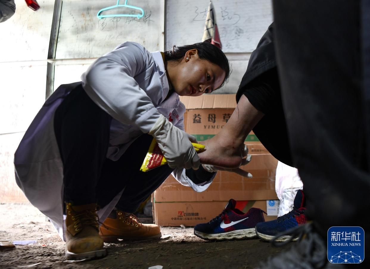 西藏那曲市比如縣良曲鄉(xiāng)然木塘村蟲草采集點(diǎn)的營(yíng)地里,政府為采集點(diǎn)配備的醫(yī)護(hù)人員在給采集蟲草時(shí)受傷的牧民治療(5月26日攝)。新華社記者 晉美多吉 攝