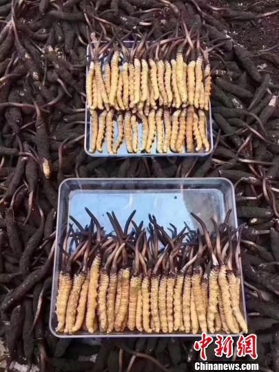 圖為近日,西藏農(nóng)牧民采挖到的蟲草?!『闻罾凇z