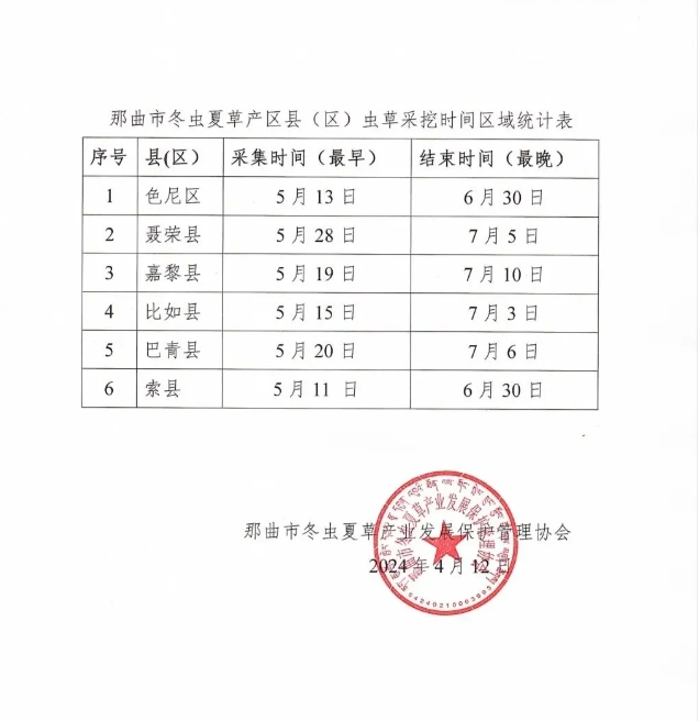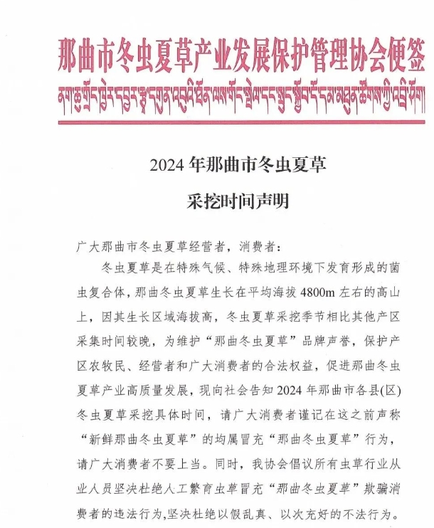 冬蟲夏草是在特殊氣候、特殊地理環(huán)境下發(fā)育形成的菌蟲復(fù)合體,那曲冬蟲夏草生長在平均海拔4800m左右的高山上,因其生長區(qū)域海拔高,冬蟲夏草采挖季節(jié)相比其他產(chǎn)區(qū)采集時間較晚,為維護(hù)“那曲冬蟲夏草”品牌聲譽,保護(hù)產(chǎn)區(qū)農(nóng)牧民、經(jīng)營者和廣大消費者的合法權(quán)益,促進(jìn)那曲冬蟲夏草產(chǎn)業(yè)高質(zhì)量發(fā)展,現(xiàn)向社會告知2024年那曲市各縣(區(qū))冬蟲夏草采挖具體時間,請廣大消費者謹(jǐn)記在這之前聲稱“新鮮那曲冬蟲夏草”的均屬冒充“那曲冬蟲夏草”行為,請廣大消費者不要上當(dāng)。同時,我協(xié)會倡議所有蟲草行業(yè)從業(yè)人員堅決杜絕人工繁育蟲草冒充“那曲冬蟲夏草”欺騙消費者的違法行為,堅決杜絕以假亂真、以次充好的不法行為。