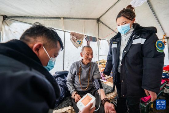 在那曲市索縣西昌鄉(xiāng),衛(wèi)生院醫(yī)務(wù)人員為蟲草採(cǎi)集點(diǎn)的牧民測(cè)量血壓(5月18日攝)。新華社記者 丁增尼達(dá) 攝